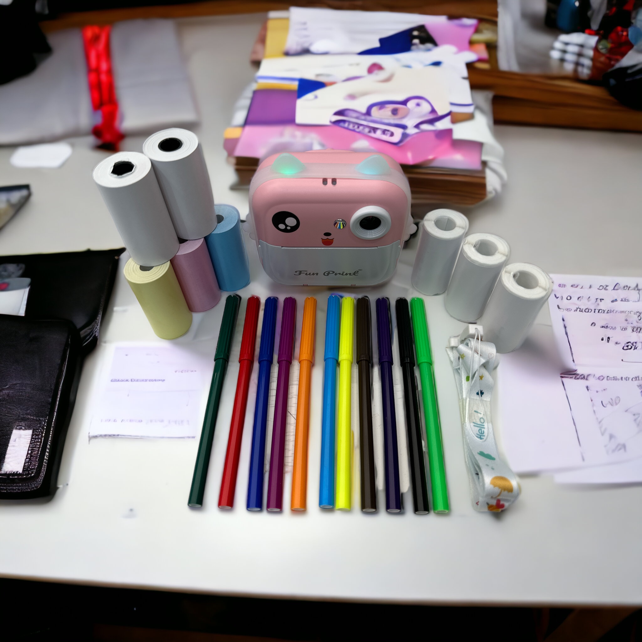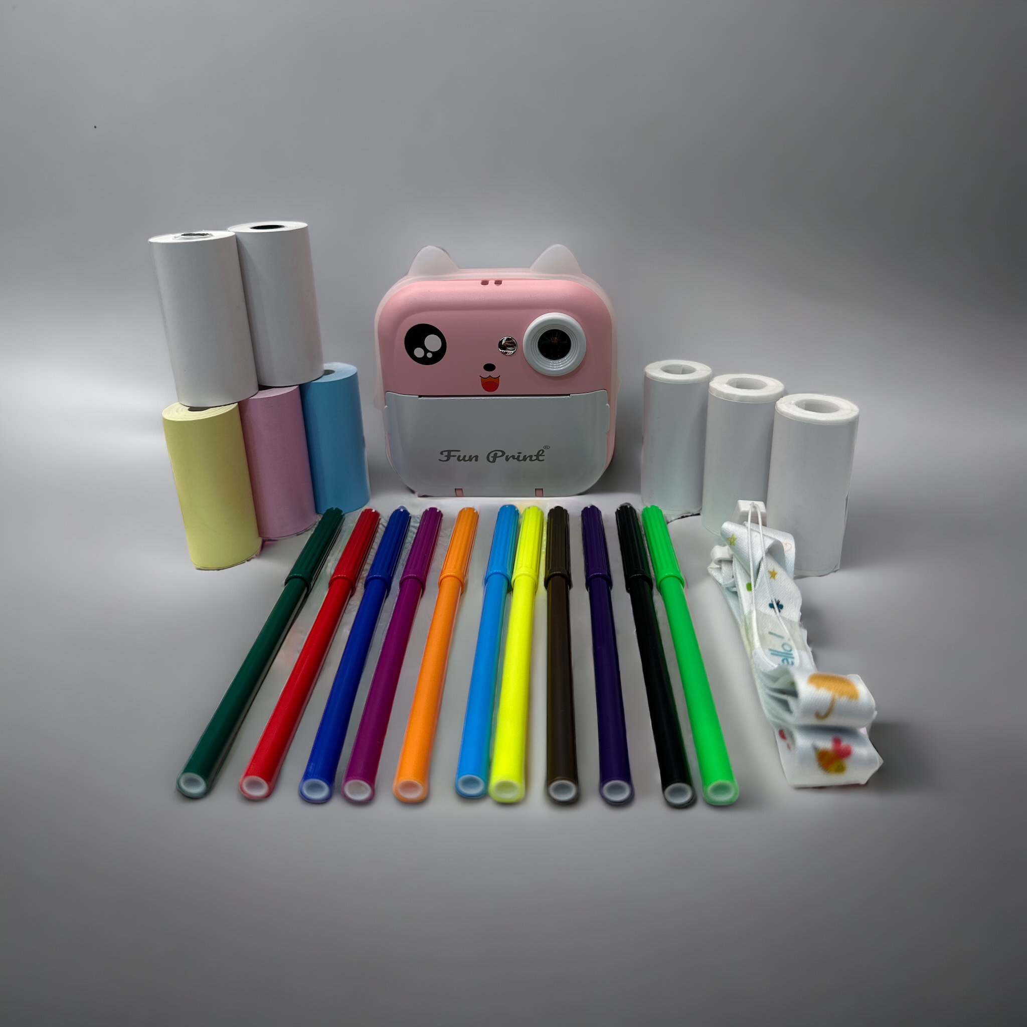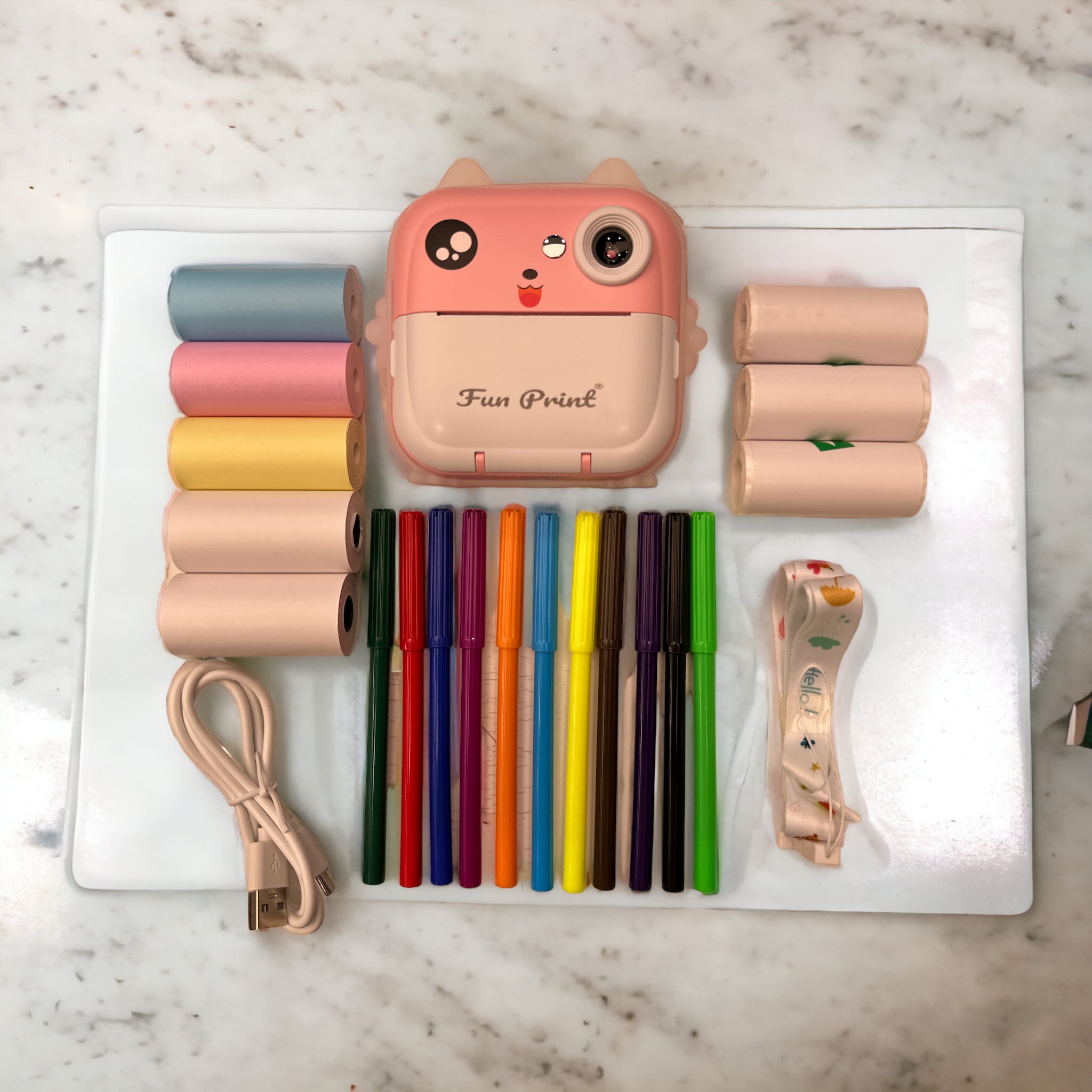 - Kutu İçeriği: 1 x termal yazıcı, 3 x beyaz termal kağıt rulosu, 3x Renkli Termal Kağıt, 1 x USB kablosu, 1 x kordon (Askı),1 x kullanım kılavuzu, 1x 12’li renkli kalem seti
